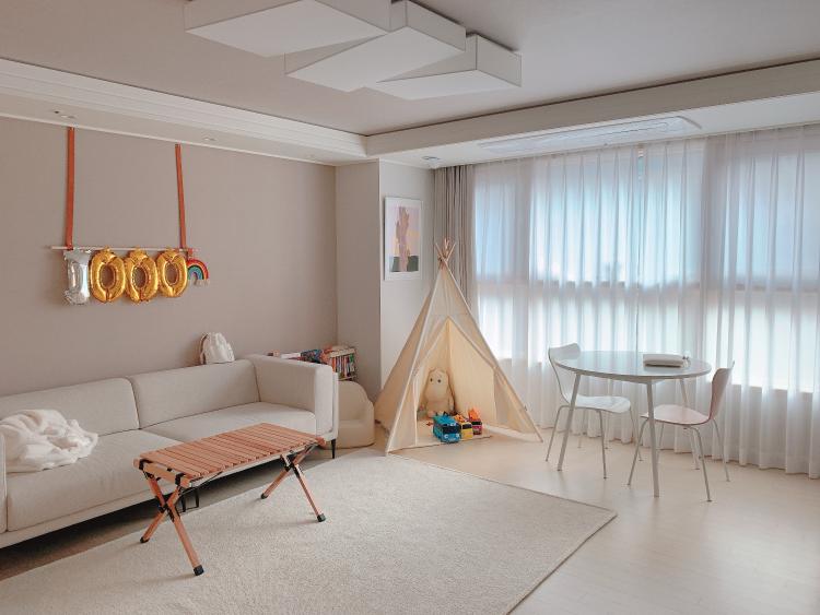 변화를 주기 전 저희 집 거실 모습이에요. 겨울을 맞이해 아이에게 인디언 텐트를 꺼내주고 원형 식탁을 창가 쪽에 두고 사용했어요.