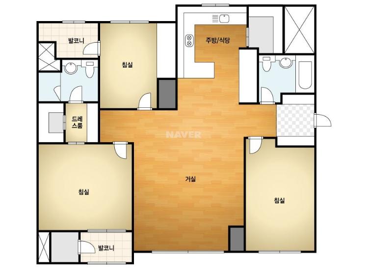 저희 집 아파트 도면입니다. 일반적인 확장형 판상형 구조이지만 주상복합아파트라 36평치고 좁게 나왔답니다. 이사 올 당시 6인용 식탁을 크게 두고 싶었는데 생각보다 주방 쪽 식탁 두는 부분이 협소에 4인용이 이상은 둘 수가 없더라고요. 그래서 넓은 6인용 테이블 대신 원형 테이블을 구매하였고요. 다른 인테리어는 하지 않아 제가 좋아하는 베이지 톤에 맞춰 집을 꾸몄답니다.