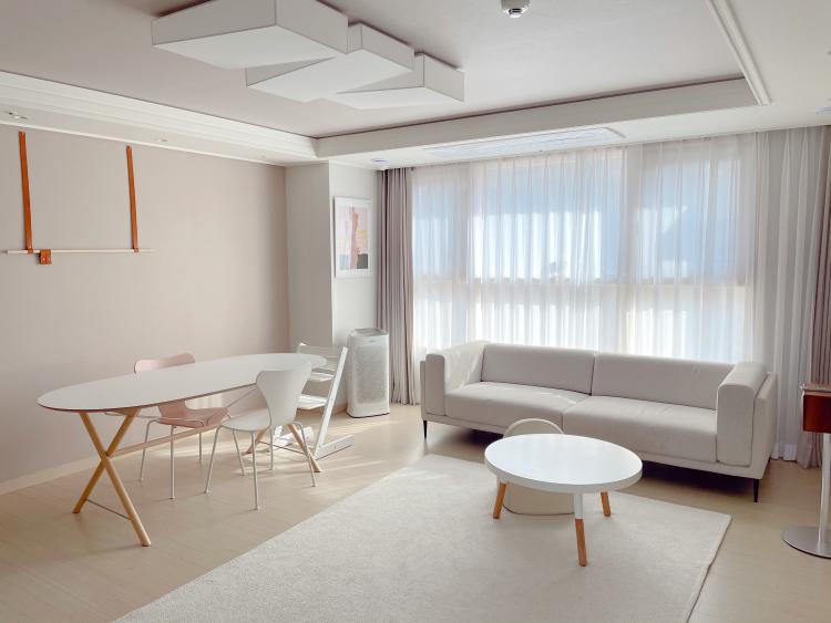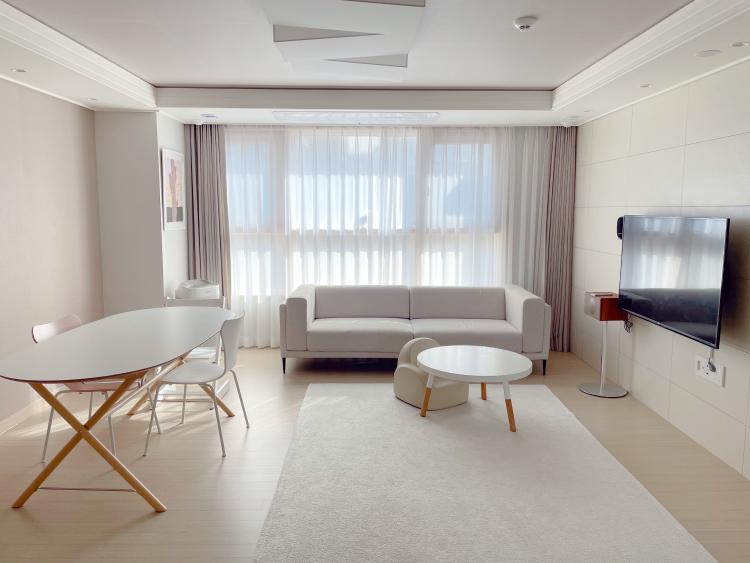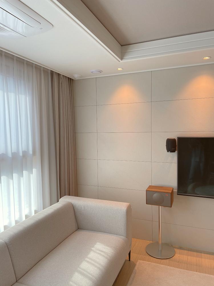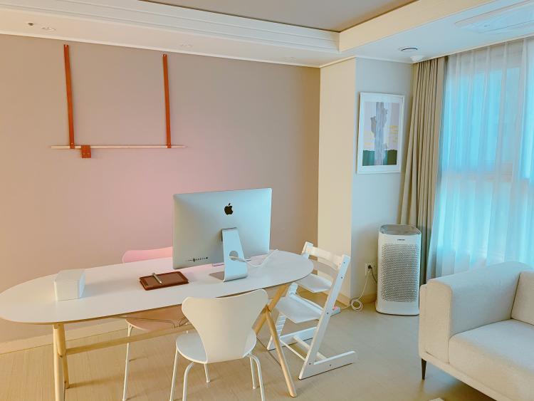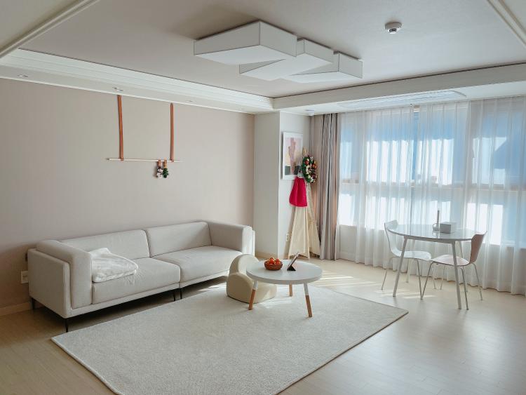 사실 저희 아파트는 뷰 맛집이지만 저희는 저층이고 저희 집과는 관계가 없는 이야기라 거실 뷰를 등지기로 했어요. 소파 위치를 창가 쪽으로 옮겨 넓은 거실 공간을 확보하였어요. 평소에 tv를 보지 않아 소파 위치를 옮겨 티브이를 봐도 딱히 불편함을 못 느끼고 생활하고 있어요.