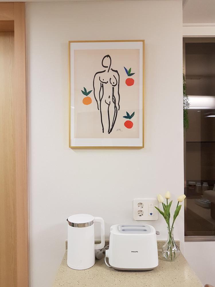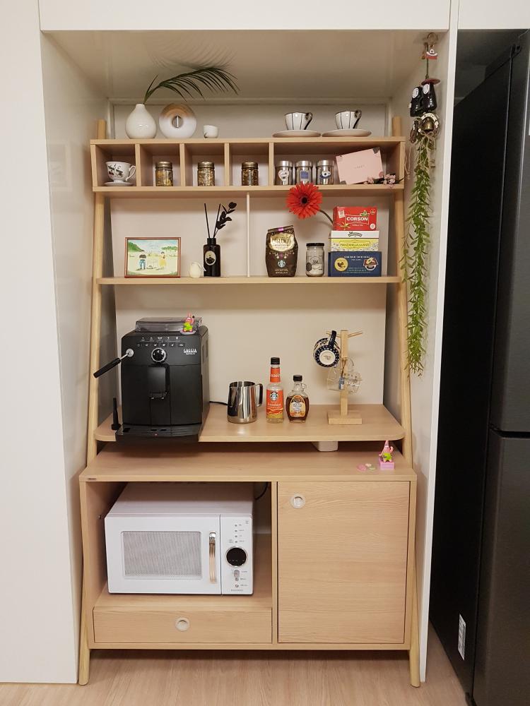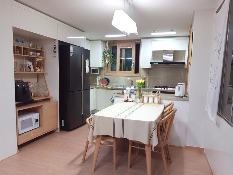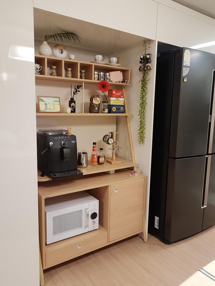입주시 가장 고민을 많이 했던 곳이 주방이었어요. 냉장고장이 짜여 있는데 김치냉장고 자리에 무엇을 두어야 할지 한참 고민을 하였죠. 홈 카페 공간으로 꾸미면 좋겠다 싶어서 맞춤가구나 기성품 서칭도 엄청 했답니다.
