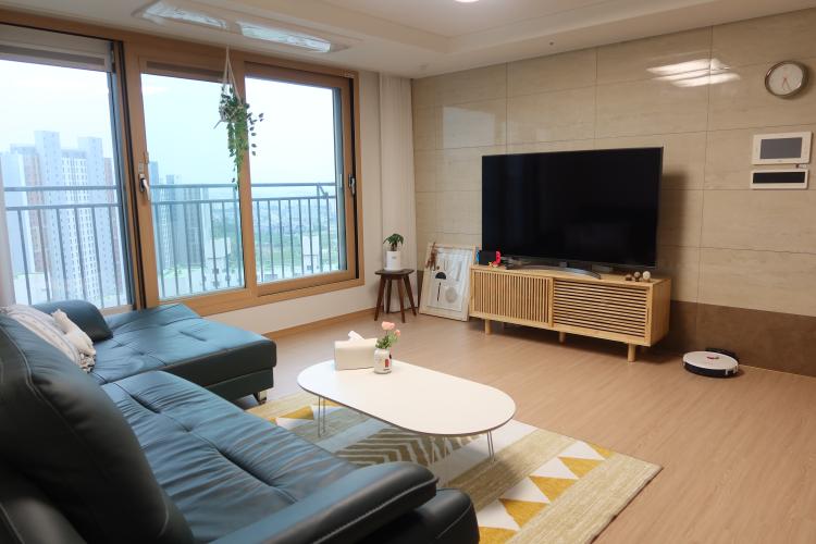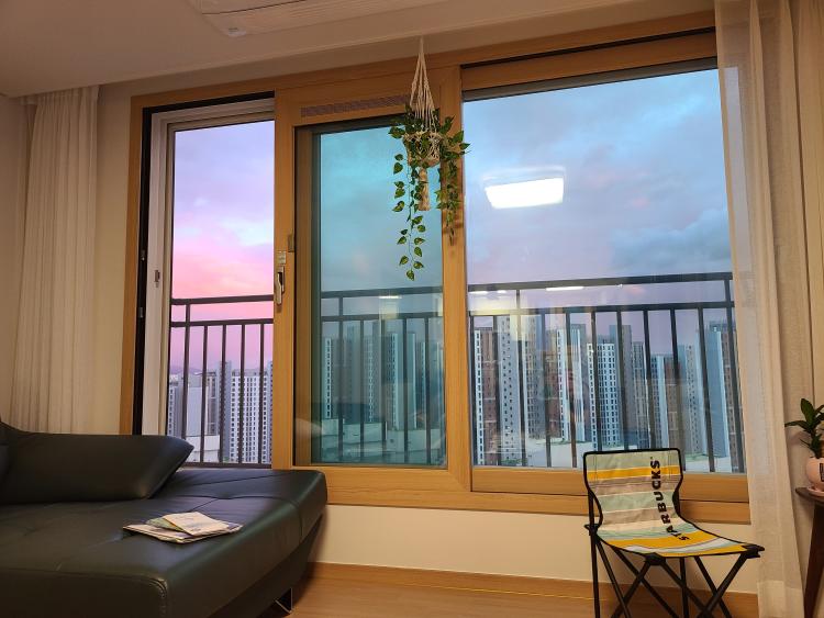 집에서 해가 질 때쯤이면 정말 멋진 하늘을 볼 수 있어요. 그래서 더욱 애정이 가는 거실의 풍경이랍니다. 액자와 러그, 쿠션은 개인적으로 귀여운 걸 좋아해서 조금 아기자기한 느낌으로 꾸며봤어요.