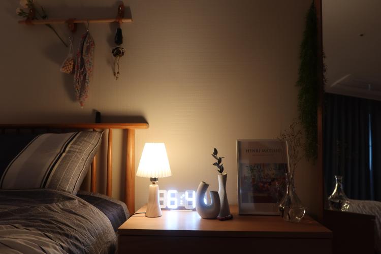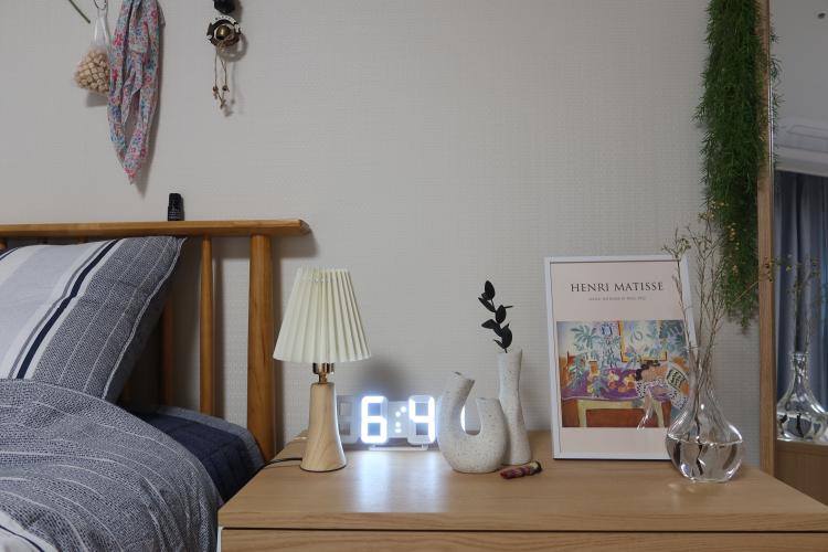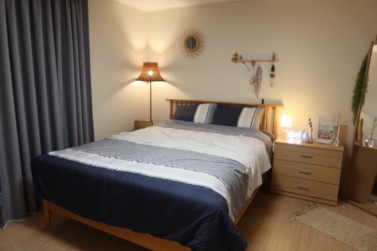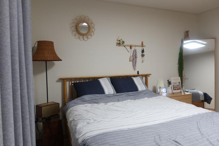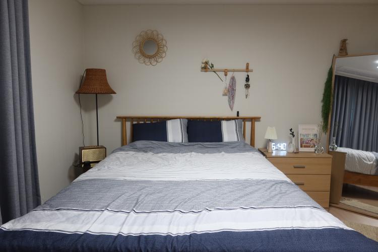 잠만 자는 공간이라고 생각할 수 있지만 가장 남편과의 대화가 많이 오가는 곳이라고도 할 수 있어요. 전체적인 인테리어 느낌이 라이트 한 우드 톤이었기 때문에 가구나 소품들도 톤과 분위기를 맞추어서 꾸며보았어요.