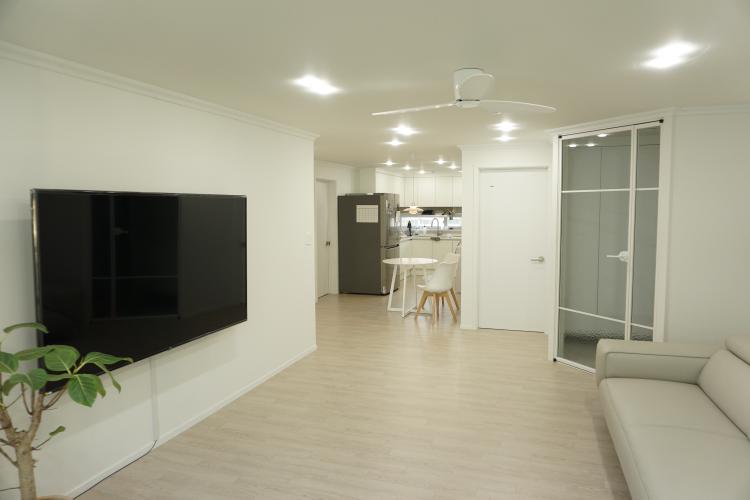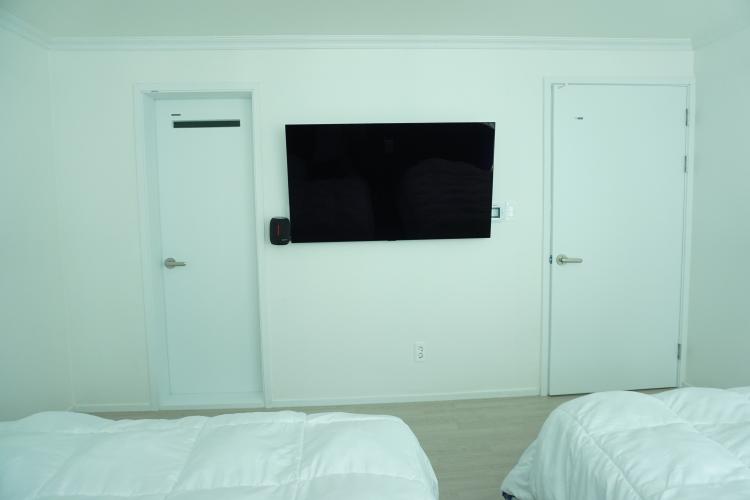침대 맞은편으로는 TV를 벽걸이로 설치하여 편하게 침대에 누워서 영화나 TV를 시청하고 있습니다.