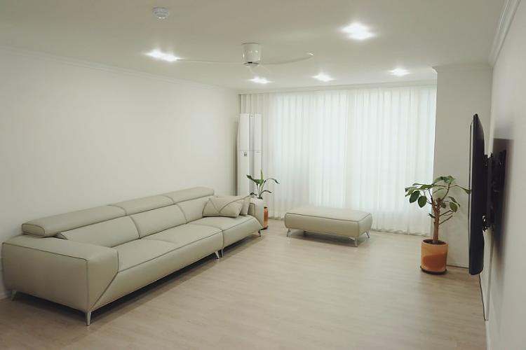 거실은 소파와 벽걸이 TV로만 구성해서 최대한 심플하게 만들어 봤습니다. 집의 인테리어를 할 때 컨셉이 화이트&심플이었는데 거실이 가장 컨셉에 적합한 공간이지 않을까 생각합니다.