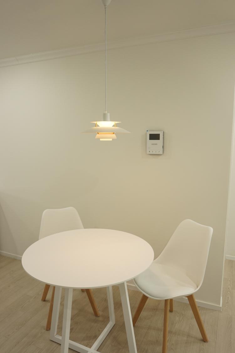 그 옆으로는 원형 식탁과 조명을 설치하여 신혼 느낌 가득하게 꾸며봤어요. 아일랜드와 식탁 모두 화이트 컨셉에 맞게끔 선택하였습니다.