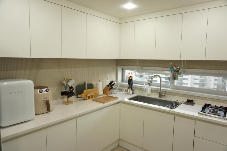 싱크대 상/하부장을 모두 무광 화이트로 제작하였고, 싱크대 상판 역시 화이트로 설치하였습니다. 주방 벽타일도 밝은 베이지 타일로 설치하여 따뜻한 느낌을 강조하였습니다.