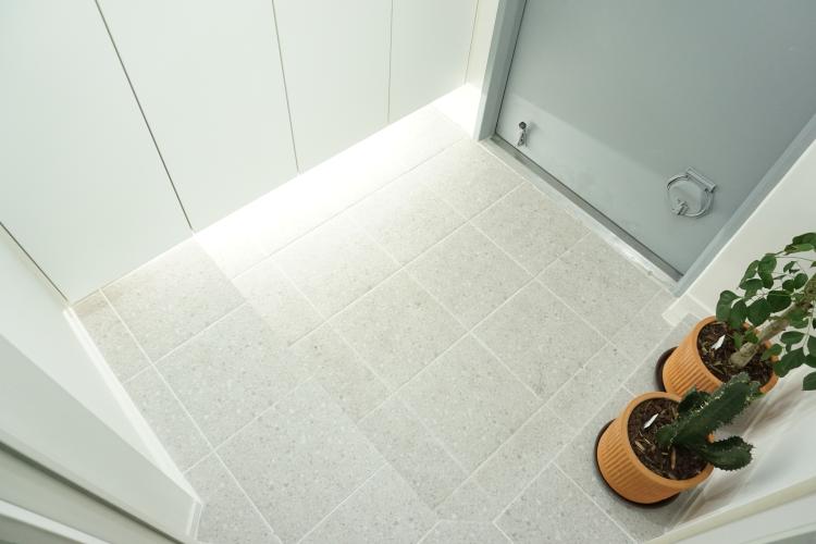 현관은 화이트 사선 중문과 밝은 색 테라조 타일로 꾸몄어요.