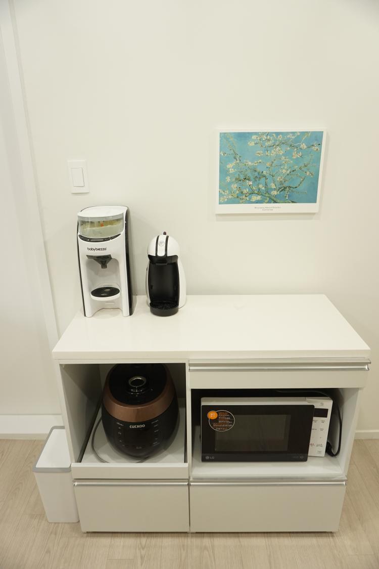 주방 싱크대 반대편으로는 아일랜드 서랍장을 두어 소형 가전제품들을 배치해두었습니다.