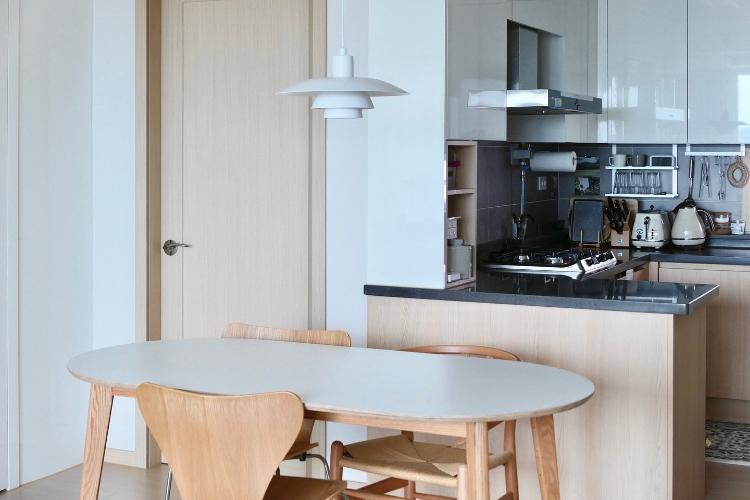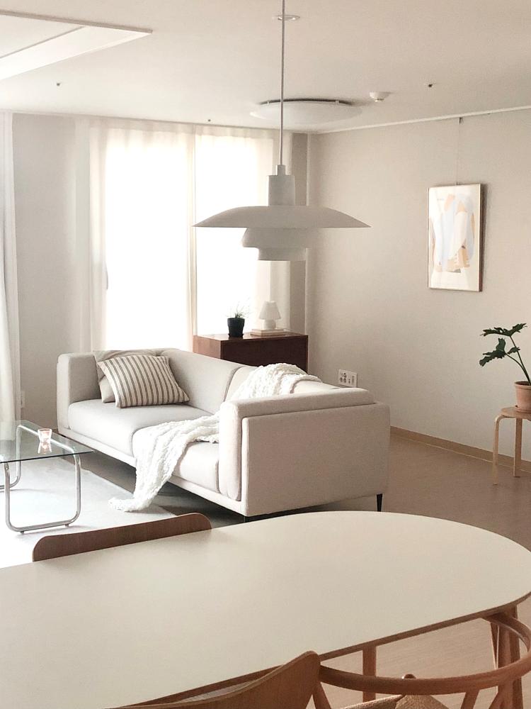 주방에서 바라본 거실의 모습입니다. 주방의 펜던트 등과 식탁이 거실의 가구들과 마치 한 세트처럼 잘 어우러져서 이 자리에서 바라본 거실의 모습을 제일 애정 하는 편입니다.