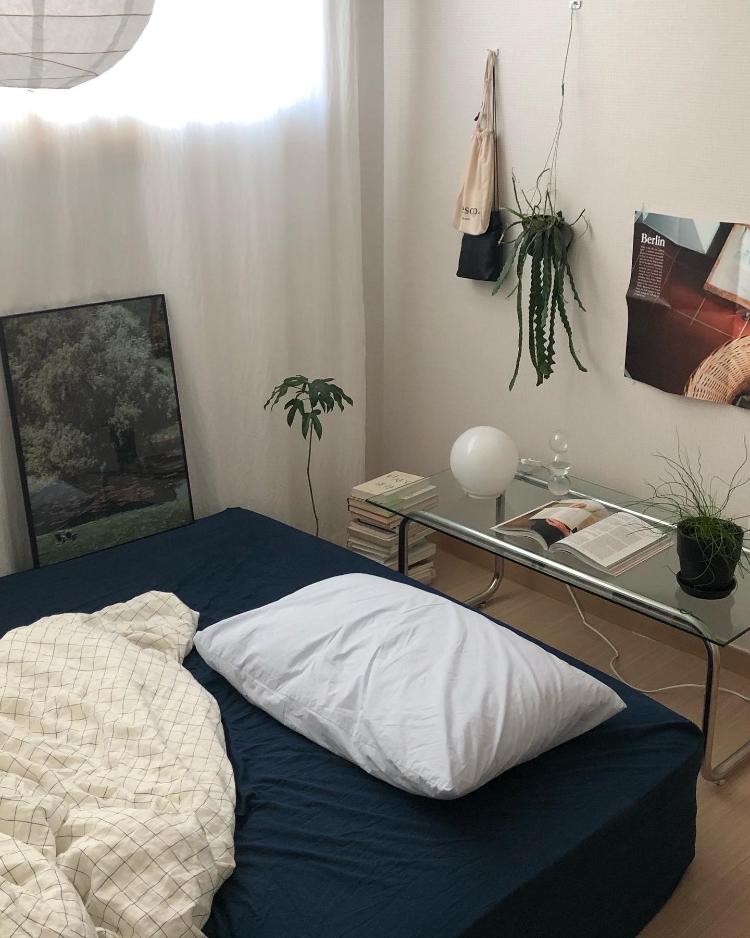 사실 손님방 겸 침실과는 또 다른 분위기의 공간을만들어 보고 싶어서 꾸민 제 사심 가득한 곳입니다. 침실에서 쓰던 네이비 색상의 매트리스 커버를 이 방으로 옮겨오고 식물들을 배치해서 생기 있지만 단정한 공간으로 만들어 보았습니다.