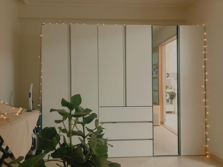 역시나 부피를 많이 차지하는 옷장도 화이트로 색을 맞추어주니 한층 보기 좋습니다. 공간을 넓어 보이게 하기 위해서 큰 거울을 인테리어로 많이 사용하는데, 이렇게 문 자체가 거울인 옷장을 고르면 훨씬 실용적입니다. 그렇다고 거울이 너무 많으면 산만해 보일 수 있으니 포인트로만 주는 것이 좋아요.
