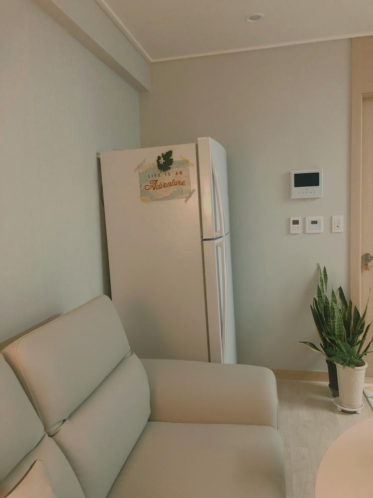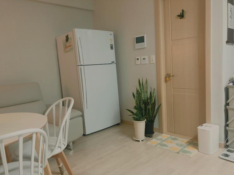 동선의 편리함을 위해서 냉장고를 부엌의 반대편으로 배치했어요. 냉장고 자리에는 요리할 때 자주 쓰는 에어프라이어와 밥솥, 전기포트 등을 두기 위해 렌지대를 두었어요. 냉장고는 실내에 두는 것 중 가장 큰 가전제품이지만 튀지 않는 색으로 골라서 눈에 띄지 않고 거실에서도 존재감을 드러내지 않습니다.