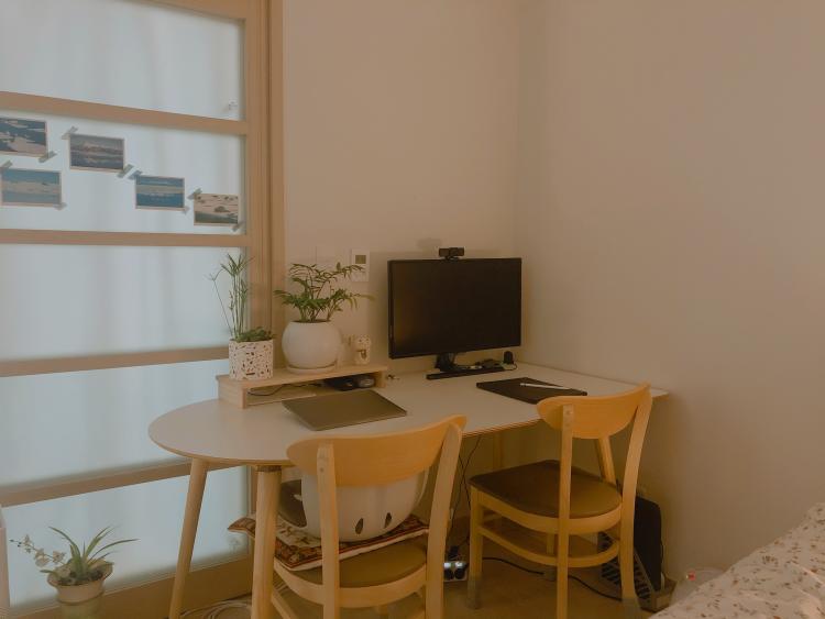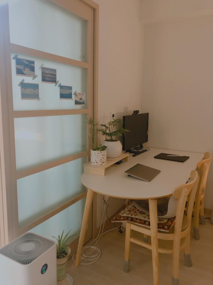 공부하는 공간입니다. 약간의 재미를 위해 반원형 테이블을 두어 뻔하지 않은 분위기를 연출합니다. 역시나 컬러는 화이트와 우드로 맞추니 집안 어느 공간에나 잘 어울립니다. 곳곳에 배치한 화분들은 싱그러울 뿐 아니라 새집증후군의 원인이 되는 포름알데히드 제거 및 공기정화, 습도 조절에도 효과적입니다.