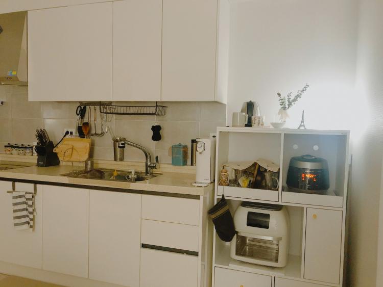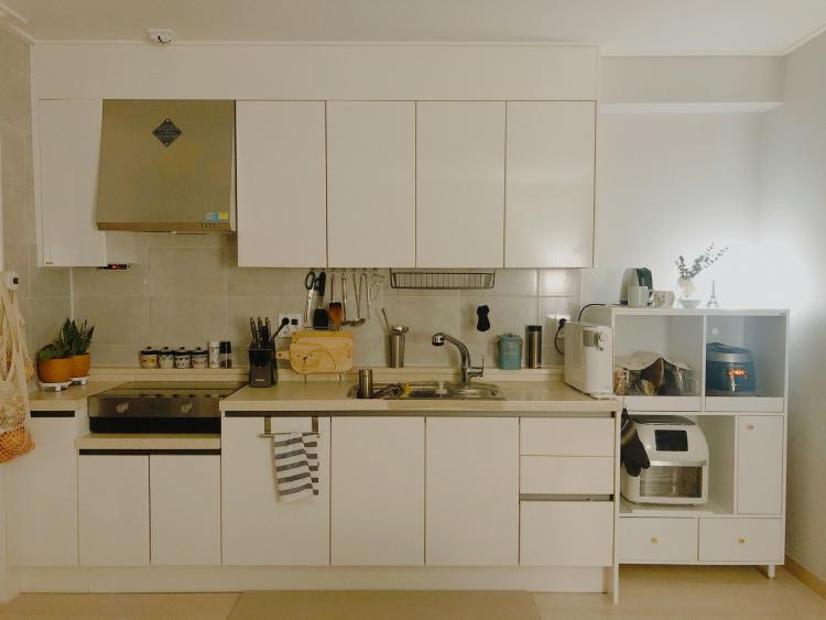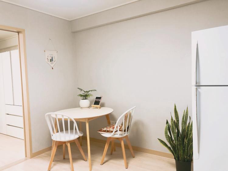 현관에 들어오면 부엌이 바로 보입니다. 오픈된 공간이라 가능한 한 깔끔하게 두는 것을 목표로 했어요. 기본 구조와 색감이 무난한 편이라서 소품들만 신경썼습니다. 화이트와 우드로 베이스 컬러를 정했어요. 왠만한 가구나 가전제품은 색을 통일하면 집이 넓어보이면서 깔끔하게 보입니다.