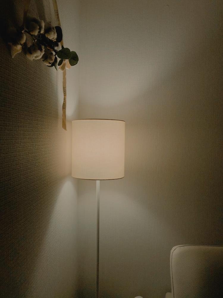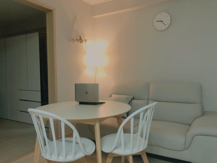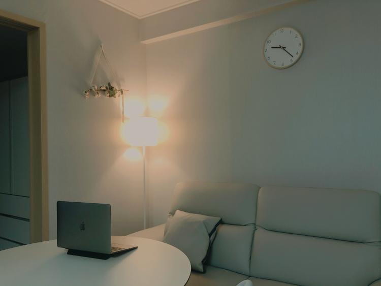 냉장고 옆쪽으로는 소파를 배치했어요. 따로 소파용 테이블을 두지 않고 화이트 원형 테이블과도 높이가 얼추 맞아서 여기서 컴퓨터 작업을 하기도 하고, 식사도 하고 다용도로 사용하고 있어요. 노란 조명의 장스탠드가 저녁 분위기를 담당합니다.