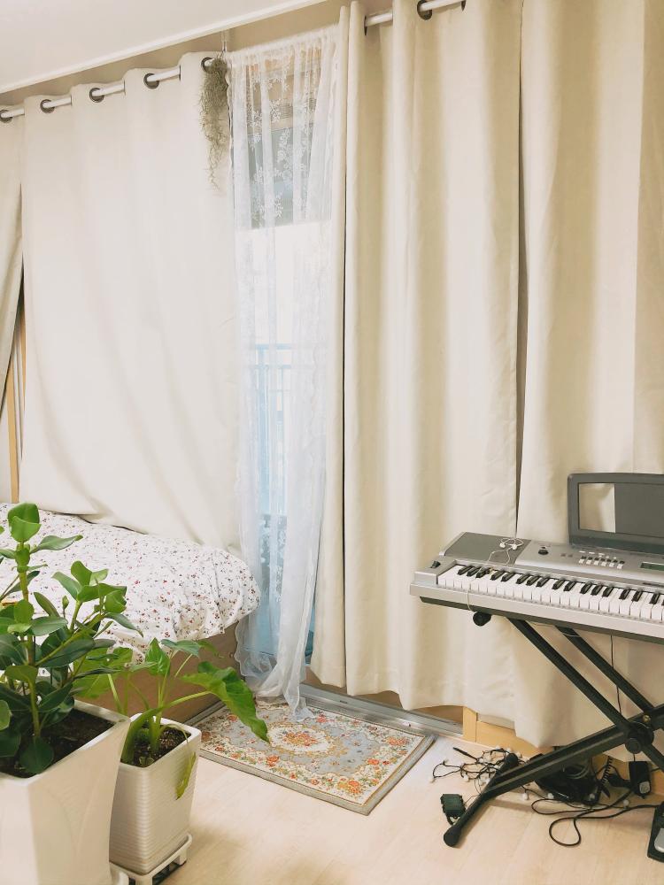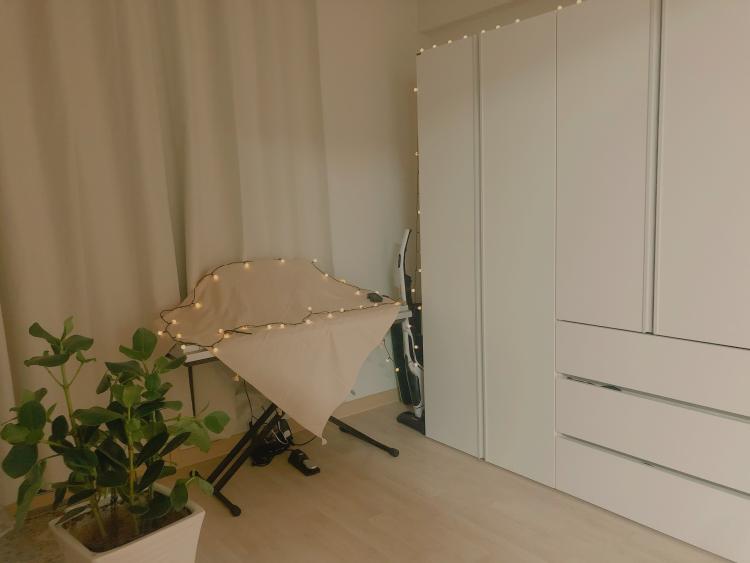 무리해서 옷장을 벽에 맞추지 않고 일부러 여유 공간을 둬서 청소기나, 운동매트, 폼롤러 등 자주 사용하지만 미관을 해치는 물건들을 숨겨두는 공간으로 사용합니다. 꼬마전구 조명을 사용하면 간단히 아늑한 분위기와 캠핑 분위기를 연출할 수 있습니다.