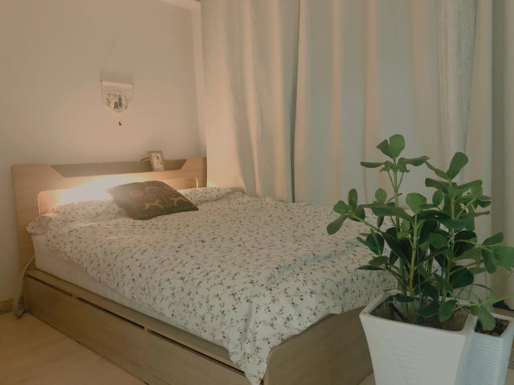 작은 집일수록 수납 공간이 필요합니다. 수납침대를 둬서 하단 서랍과 매트리스 밑에 하부장을 사용해 계절 옷과 이불을 수납합니다. 헤드에 선반과 led등, 충전기가 있으면 따로 사이드 테이블과 등을 두지 않아도 되어 실용적입니다.