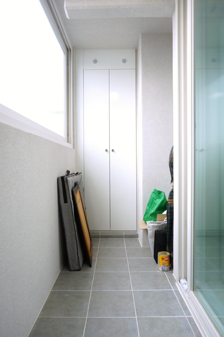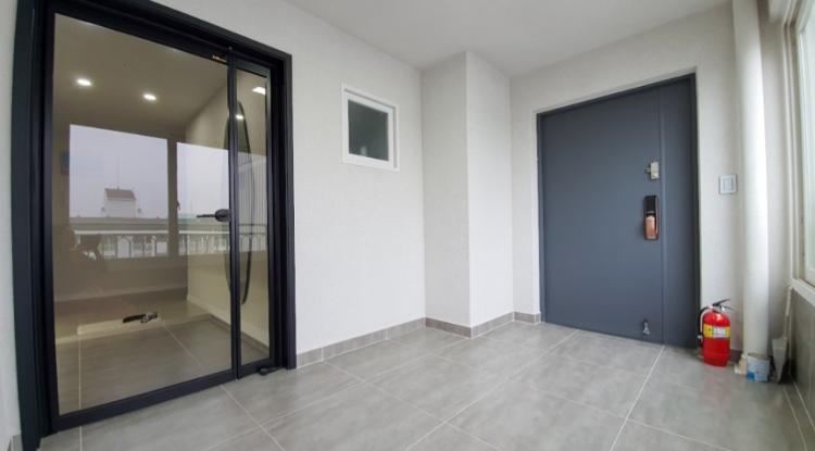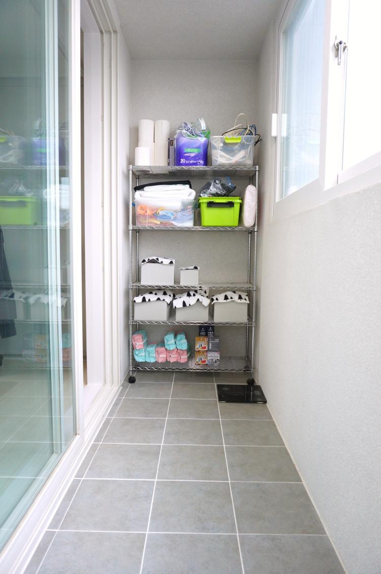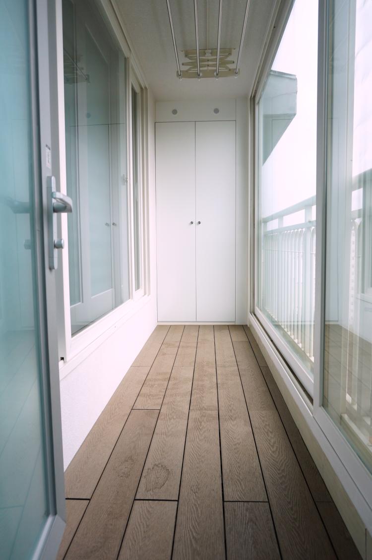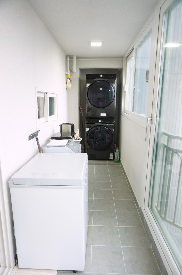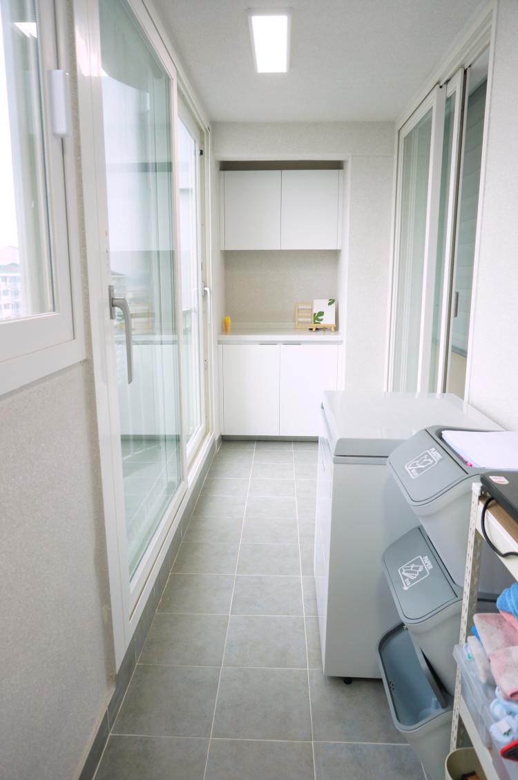 주방베란다 입니다. 주방 베란다 역시 욕실 바닥 타일과 통일 시켰습니다. 왼편의 큰 창호만 이번에 새로 설치했어요.