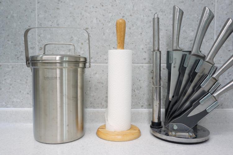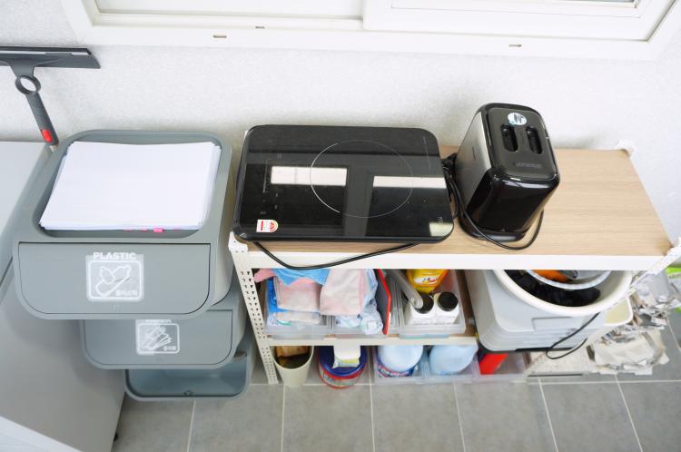 주방 미니창 앞 쪽에는 2단 선반과 재활용 분리 수거함을 놓고 자잘한 것 보관 중입니다. 이곳 공간에 예쁜 패브릭으로 가림천을 만들어 줄 계획이 있어요. 좀 더 예쁘게 꾸미고 싶답니다.