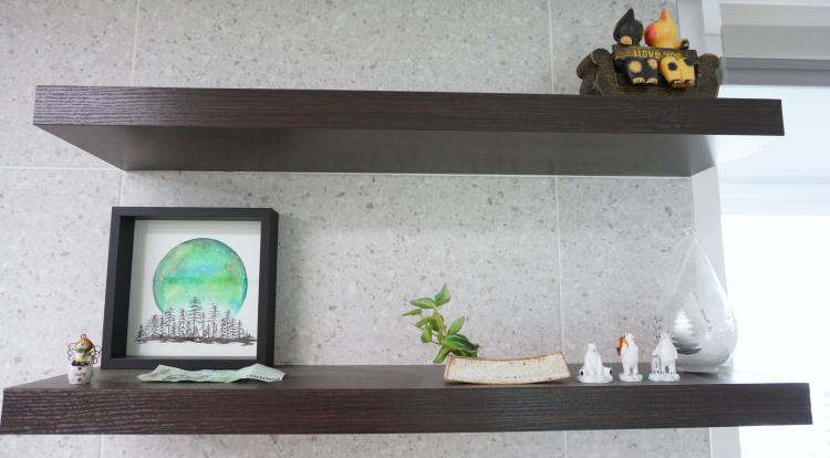 주방 벽타일은 욕실의 타일과 통일 했습니다. 대신 욕실은 세로형 시공, 주방은 가로형 시공을 했습니다. 상부장 없는 화이트 주방이 소원이었던 지라 소원 성취 했습니다. 대신 밋밋한 벽면에 무지선반을 달아서 소품으로 꾸며봤고요. 주방은 소품들로 좀 더 꾸밀 계획이 있어요.