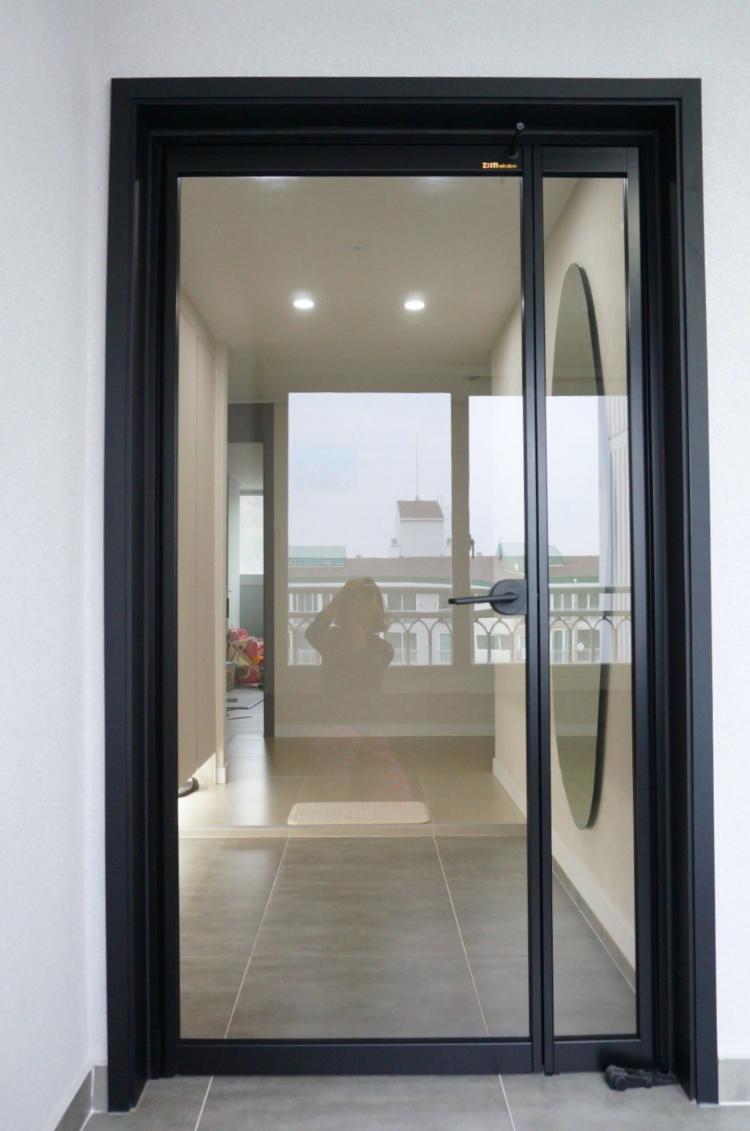 중문을 열었을 때와 닫았을 때 차이. 중문 유리는 브론즈 색감이 약간 들어간 브론즈 투명유리로 선택했습니다. 완전 투명보다 멋스러워요. 신발을 신고 다니는 바닥면의 포세린타일, 신발을 벗고 올라오는 바닥면의 포세린타일. 2가지 공간의 타일 색을 다르게 해서 공간 구분을 해 주었습니다. 저는 무광의 타입으로 선택했어요.