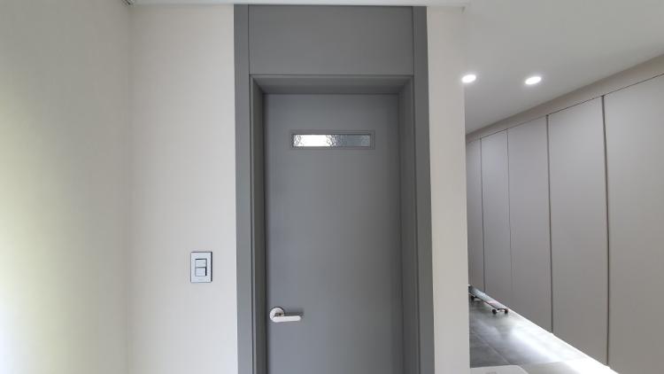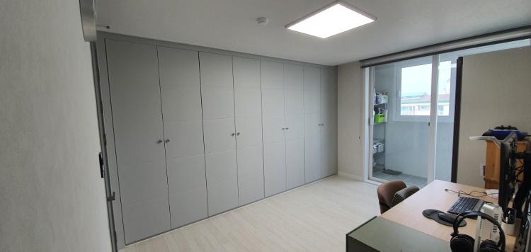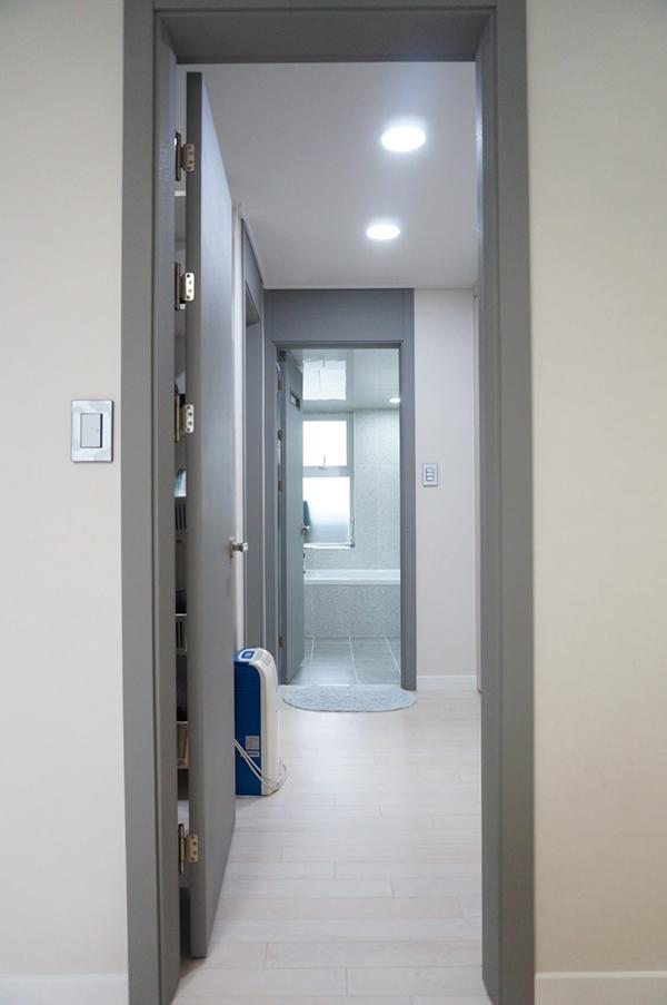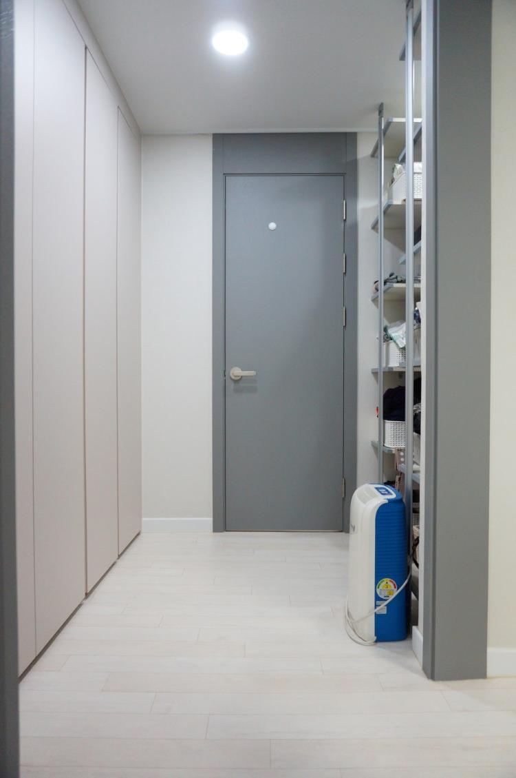 안방에서 바라본 드레스룸 공간입니다. 안방에서 드레스룸을 지나면 안방 화장실이 나오는 공간입니다. 방은 모두 강마루 시공했어요. 문지방은 없앴습니다. 저희는 이번에 리모델링 하면서 방 문은 모두 철거하고 새로 시공했어요. 기존 방 문에 인테리어필름을 붙일까 새로 시공할까 고민했었는데. 사실 금액 차이가 그리 크지 않아요. 그래서 철거하고 새로 시공했는데 만족해요.