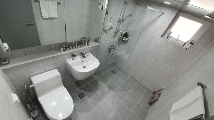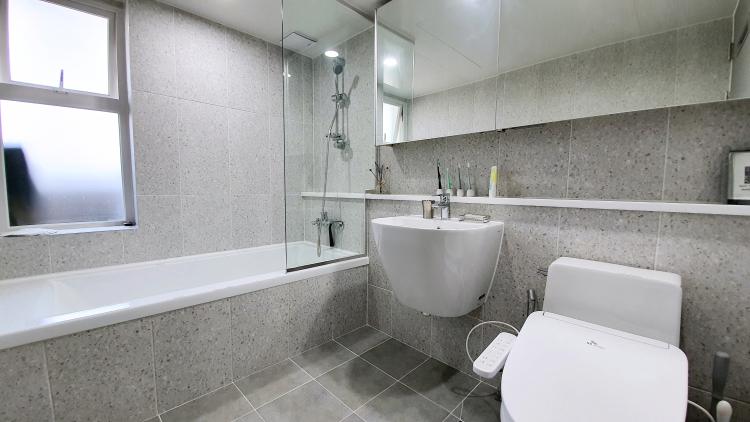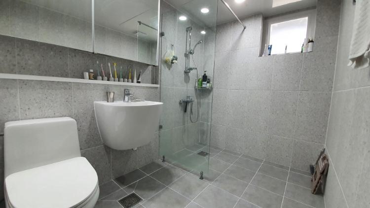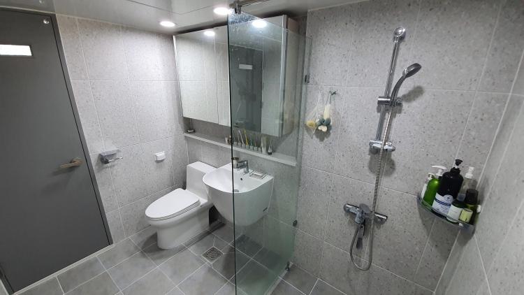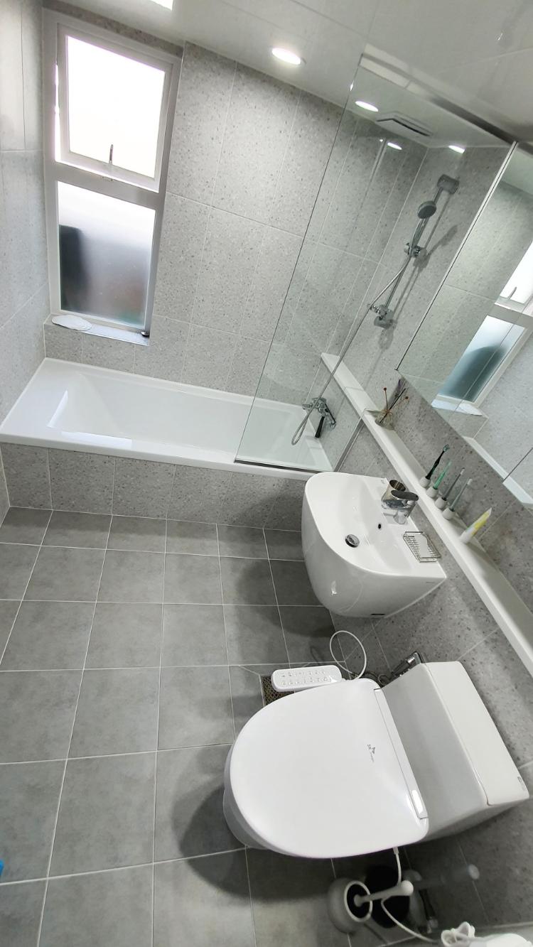 이곳은 안방 화장실입니다. 안방 화장실은 욕조가 있어요. 물이 튀지 않도록 유리 파티션 설치했는데. 너무 만족해요.
