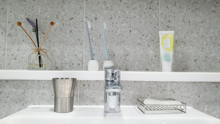 물이 덜 튀니 청소도 더 쉬워졌어요. 스텐컵과 비누 받침대는 마트 갔을 때 하나씩 구매해 왔습니다.
