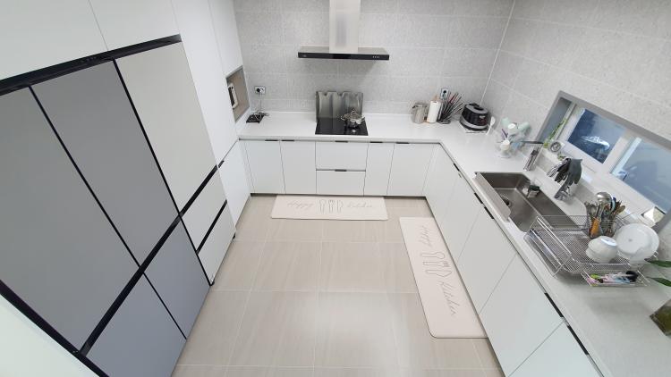 가스레인지 사용하다가 전기인덕션 사용해 보니 청소도 더 쉽고 빨리 끓어서 확실히 좋아요. 전기공사는 따로 했습니다. 내 관절도 소중하다면서 이번에 더 푹신푹신한 주방매트로 바꿨습니다.