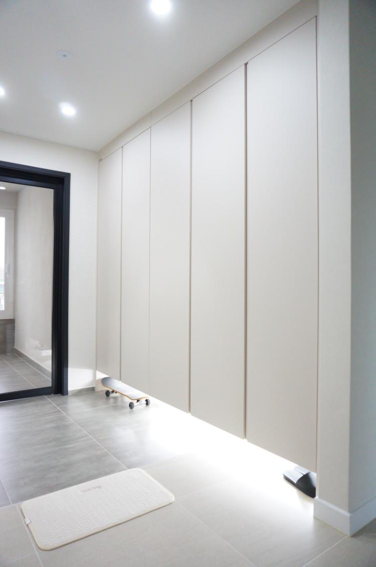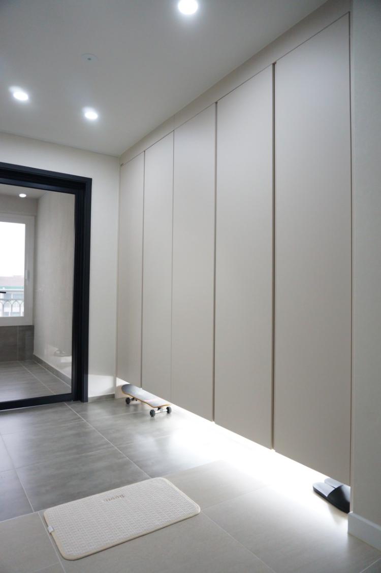 중문을 지나 신발장은 하부띄움 시공했어요. 아랫쪽에는 간접조명을 넣어봤고요. 시각적으로 답답해 보이는 게 싫어서 아랫쪽을 띄웠습니다. 사실 저희 가족은 신발이 많지가 않아요 ^^