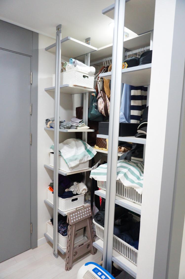 드레스룸은 붙박이장 새로 시공했고요. 붙박이장 맞은편은 원래는 화장대 자리였었어요. 폭이 88cm나 되다 보니 기존 붙박이장 설치 시 공간이 많이 남더라고요. 붙박이장은 보통 60cm 폭이죠. 그래서 사제로 시공한 오픈 행거에요. 이 공간에는 제가 그날 그날 입은 옷을 걸어둡니다. 입었던 옷을 다시 붙박이장 안에 넣어두기 좀 찜찜해서 그렇게 활용하고 있어요. 제가 패브릭으로 덮어둔 박스들은 남편과 저의 속옷 박스입니다. 원래는 오픈해 두고 사용합니다. 속옷을 이렇게 박스에 담아서 오픈 형태로 사용하다 보니 상당히 편리합니다. 서랍을 열지 않아도 돼요 ^^