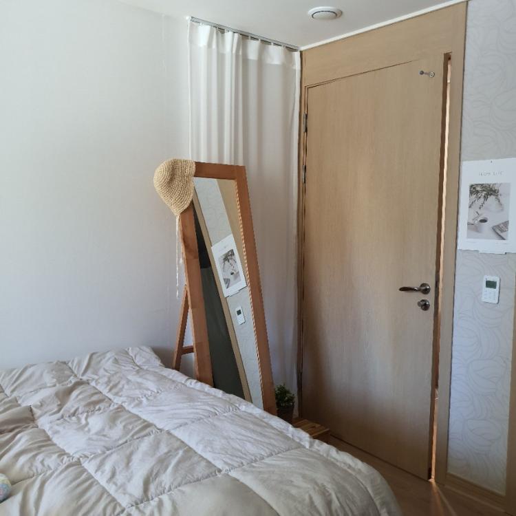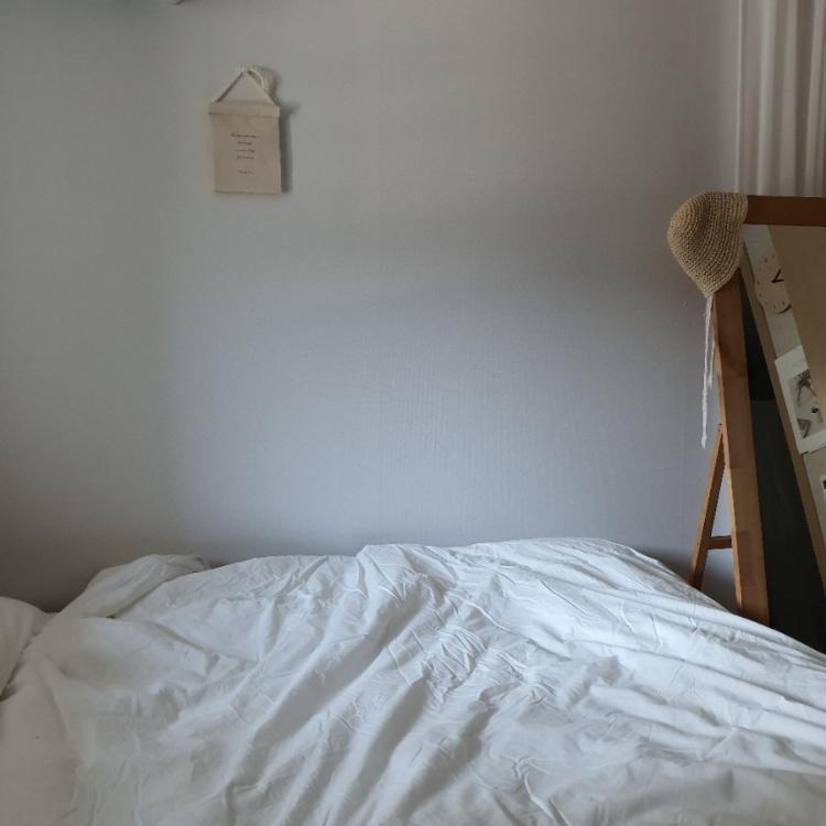 안방 벽지는 기본 옵션에서.. 최악으로 그레이 꽃무늬 벽지였답니다. 처음엔 도배도 하면 안 되는 줄 알고 꽃무늬 벽지와 함께 살다가, 마침 저희 딸 이 벽지를 찢어버리는 바람에, 화이트로 다시 도배를 한 공간입니다. 방이 좁을수록 역시 벽면은 화이트로 추천합니다.