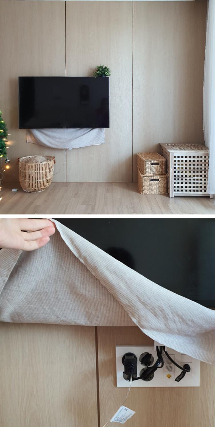 벽걸이 TV 밑으로 보이는 콘센트들까지 벽면 안쪽으로 내장공사해 버리고 싶지만 여기는..? 군인 아파트죠😔 저거 가린다고 이 방법 저 방법 다 써보았지만 시공 없이 콘센트 가리는 법은 가림막 커튼이 최상의 해결책이네요.