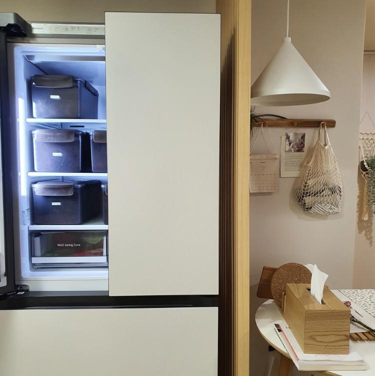 제가 삼성비스포크 김치냉장고를 선택한 가장 큰 이유, 디자인입니다. 앞서 말했듯 군인 아파트 특성상 구조변경이 불가능하여, 안 그래도 좁은 주방에 김치냉장고를 들이면 주방을 감당할 자신이 없었습니다. 그러나 삼성비스포크는 제품 특유의 깔끔한 디자인 덕에 좁은 주방에 들어오더라도 무관할 것이라고 판단했습니다.
