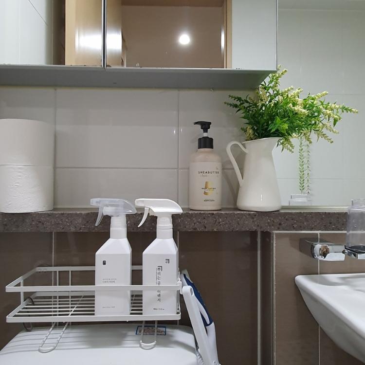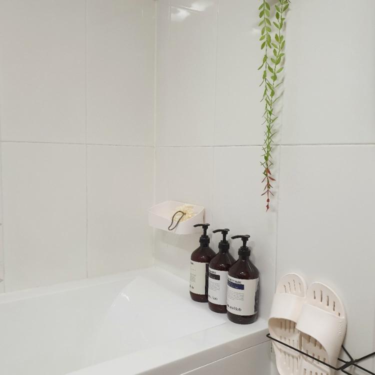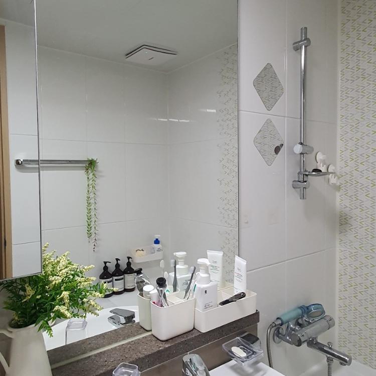 욕실용품들은 화이트 계열로 사용하고요. 그린 인테리어로 조화 데코🍃도 해주었네요. 결국 청소 또 청소가 답입니다.