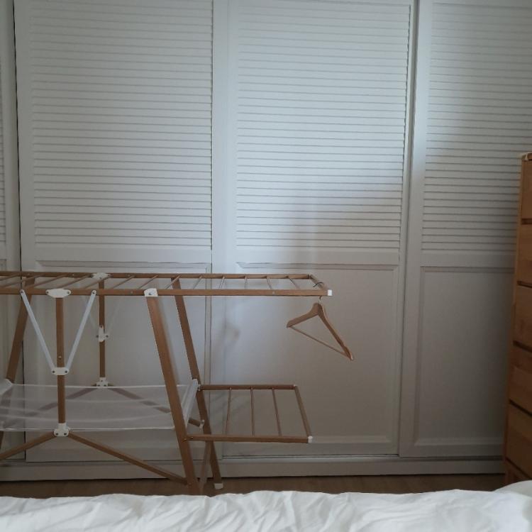 겨울에는 건조대가 방안으로 들어와야 하기에, 실내 인테리어 헤치지 않는 원목건조대를 사용중이에요.