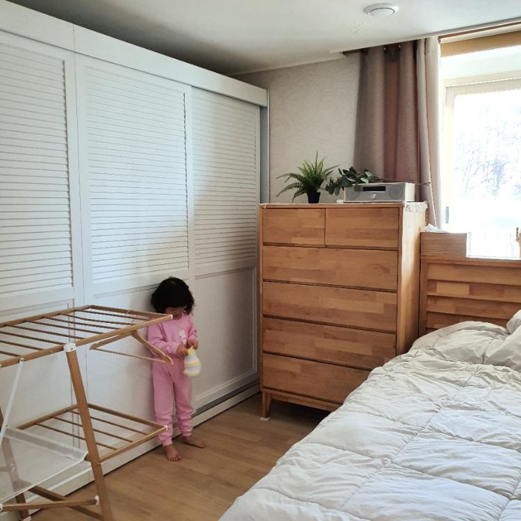 저희 아파트 침실은 굉장히 좁아요. 붙박이장과 퀸 사이즈 침대 들어가면 꽉 차는 공간입니다. 꼭 필요한 가구인 침대와 수납장들만 배치를 했고요, 침실 역시 제가 좋아하는 우드/화이트로 가구를 선택했답니다. 방이 워낙 좁으니 더 이상의 손이 갈 수 없었던 점이 아쉬운 부분입니다