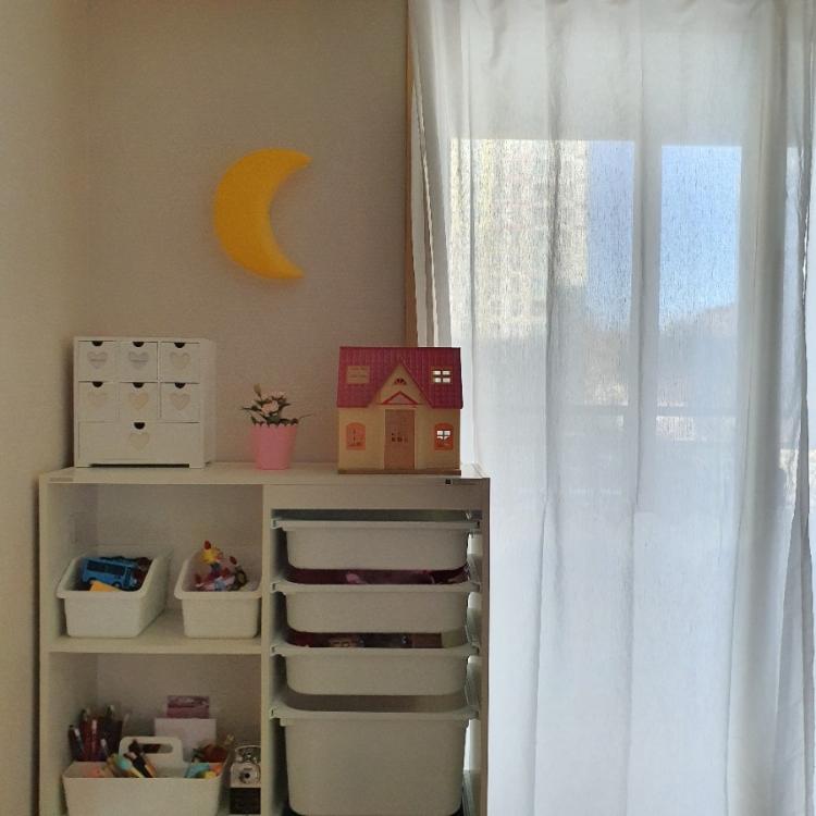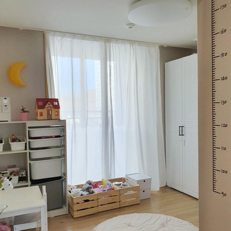 이케아 화이트 커튼을 이용해서 공간을 나눴는데, 레이스라서 답답하지 않고 아늑한 느낌이라 만족하고 있어요.