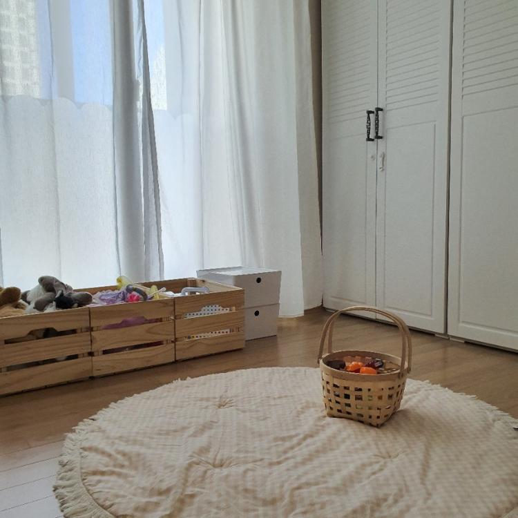 그렇게 수납장들 중고로 팔고, 책장은 베란다로 빼고, 많고 많던 놀잇감들은 기부하거나 버렸습니다. 그리고 아이 방에 매트는 과감히 치우기 추천합니다. 작은 러그 하나로도 아이는 충분해요.