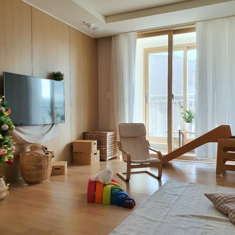 저는 워낙 우드, 원목가구를 좋아해요. 아파트의 기본 우드 몰딩과 벽면을 최대한 함께 활용해 색상을 통일시켰지요. 소품들은 자연스레 우드&라탄을 구매하게 되더라고요. 미끄럼틀도 원목이라 육아용품이 인테리어를 해하지 않도록 하고, 큼직한 가구들은 색상을 통일해 주어요.
