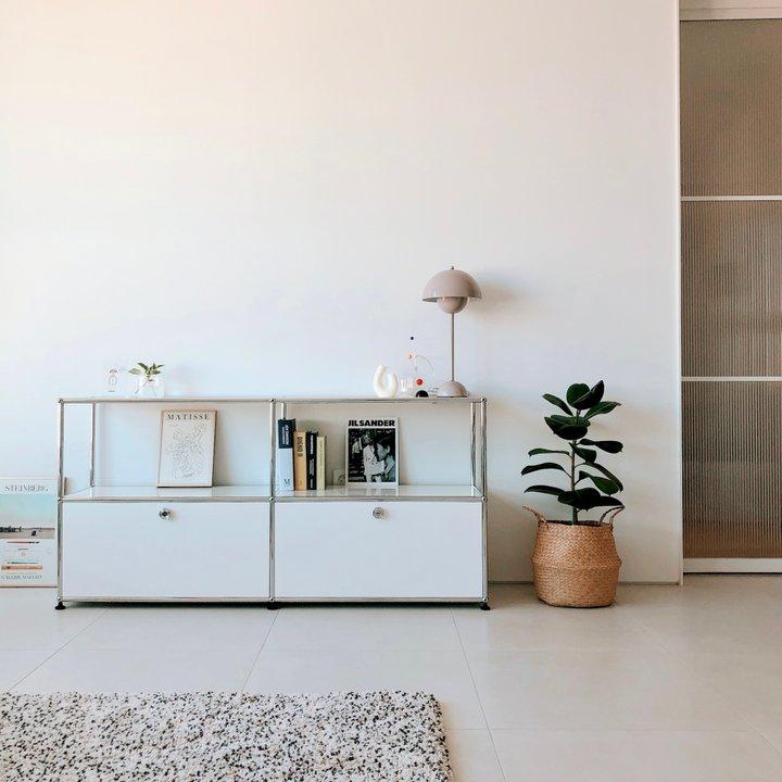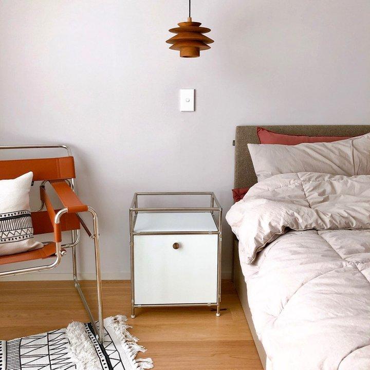 침대 사이드 테이블로 둔 제품은 직접 자재들을 구입해서 집에서 꼼지락 꼼지락(;;) 만든 모듈 가구예요. 콤비락 파이프, 합판, 강화유리 등을 주문하여 원하는 사이즈로 만들었는데, 드랍 되는 도어까지 마음에 쏙 들게 만들어져서 추가로 다른 디자인들도 만들어 보려고 합니다 :)