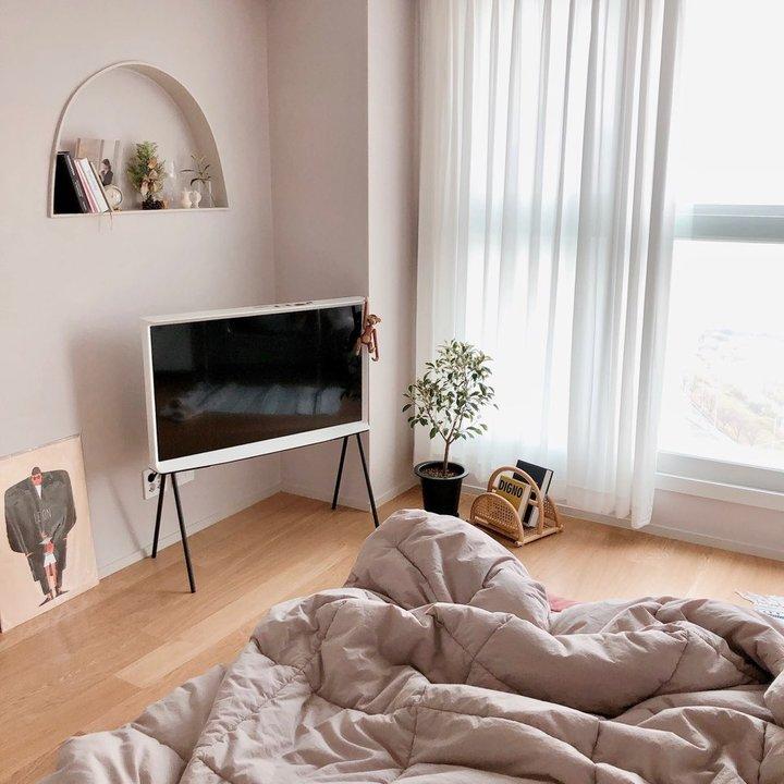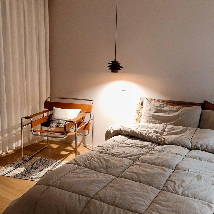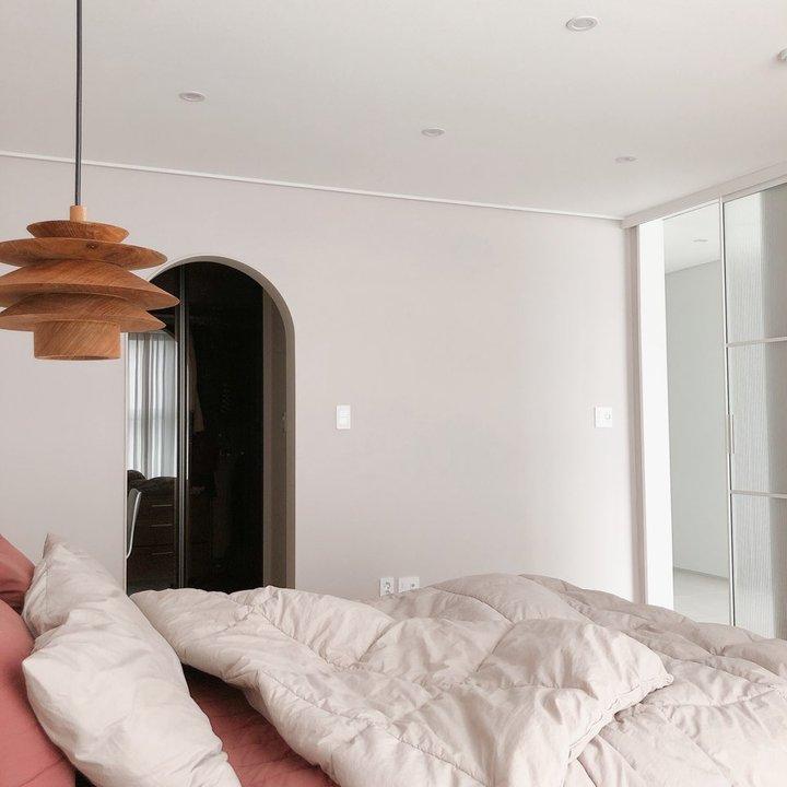안방 벽지 색상은 그레이지입니다. 자연광의 낮에 보면 옅은 그레이 컬러로 보이고 저녁에 조명 아래서 보면 은은한 분홍빛이 나는 멜란지 색상이에요. 그래서 거실보다 조금 더 따뜻한 느낌이 있죠. 두 가지 톤을 가지고 있어서 마감하고 나서 더 만족스러웠어요. 패브릭 헤드 침대를 선택하고 침구들도 레드 브라운과 웜그레이로 안정적이고 포근하게 꾸며보았습니다 :)