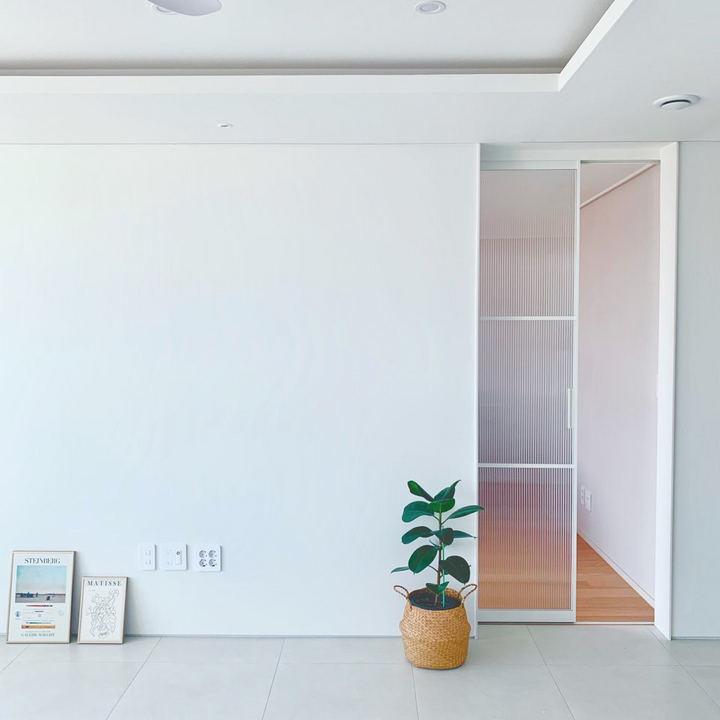 도배와 도장, 이 두 가지 마감 각각의 장,단점을 인지하고 고민한 끝에 관리 면에서 메리트가 있는 도배로 결정했습니다. 액자 레일을 설치할 천정과, 벽과 바닥의 일대일 마감이 걱정된 걸레받이 부분은 마이너스 몰딩으로 결정하고, 문선은 아예 없는 것이 살면서 불편할 수도 있겠다는 생각에 9mm의 가장 얇은 문선으로 시공하게 되었습니다. 이상과 현실의 합의점을 잘 찾는 것도 내가 살 집의 인테리어에서 중요한 부분이죠 :)