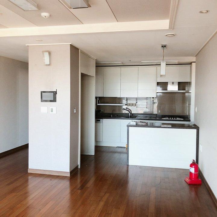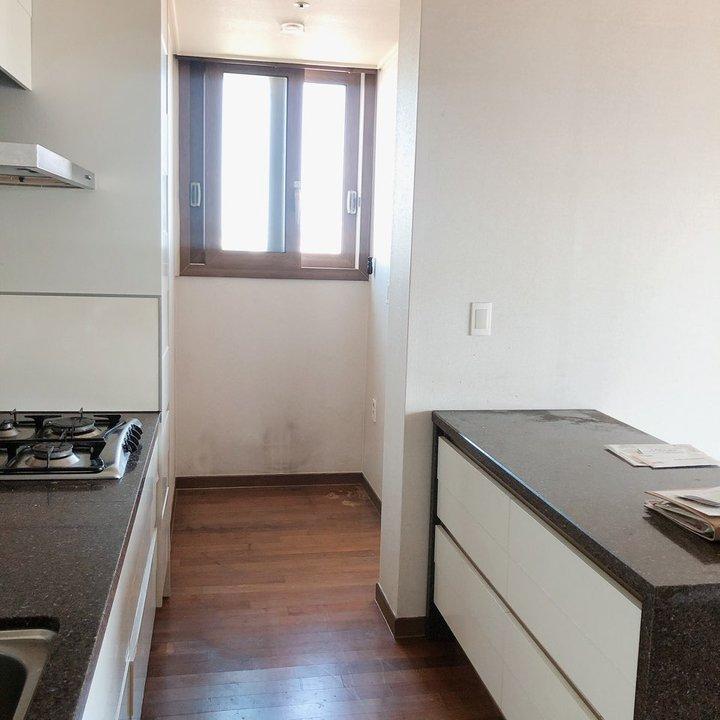 제가 생각한 이 집의 유일한 단점은 철거조차 되지 않는 주방의 내력벽기둥이었어요. 기둥 옆으로 냉장고 장이 붙어있고, 옆쪽으로는 도면에서 보셨던 주방의 입구가 있는 일자 주방에 냉(장고) 툭 튀/기(둥) 툭 튀 형태였습니다. 그래서 다른 공간에 비해 유독 더 좁고 복잡해 보이는 주방이에요. 아... 이 기둥만 없었더라면...