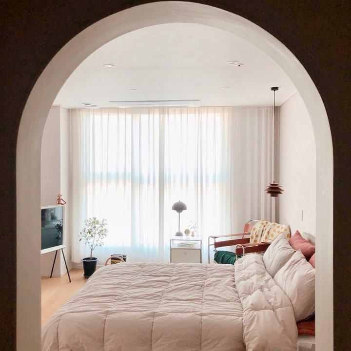 안방에서 보이는 거실로 나가는 슬라이딩 도어와 드레스룸으로 들어가는 입구 사진이에요. 드레스룸 입구를 아치로 만들었는데 아치 모양이 참 예쁘죠, 뭔가 러블리한 공간이 된 기분이랍니다 :)