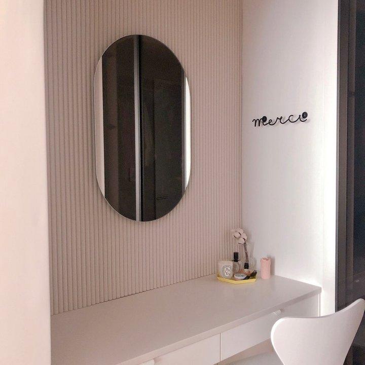 드레스룸 입구 안쪽은 파우더룸으로 만들었어요. 화장대 앞 벽면이 거울만으로는 조금 밋밋할 것 같아 공사 막바지에 입체타일로 꾸며보고 싶었는데 꽤나 비싼 가격대에, 현장 폭 사이즈에 맞게 하려니 마감이 안 떨어지더라구요. 결국 비슷한 느낌을 가진 템버 보드로 시공했습니다 :)