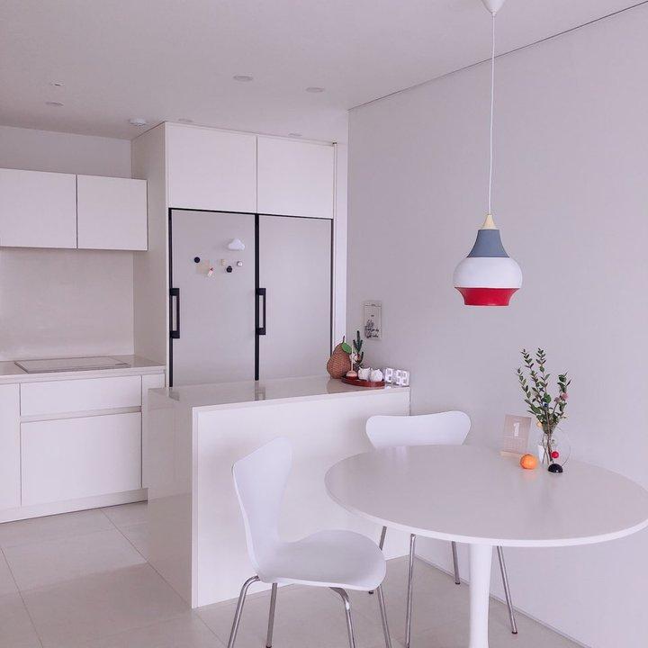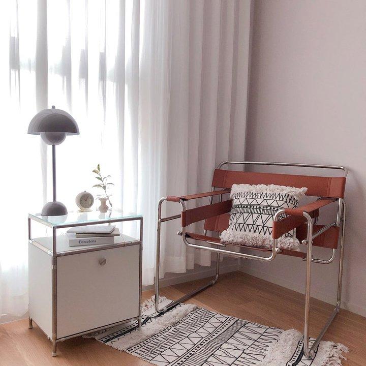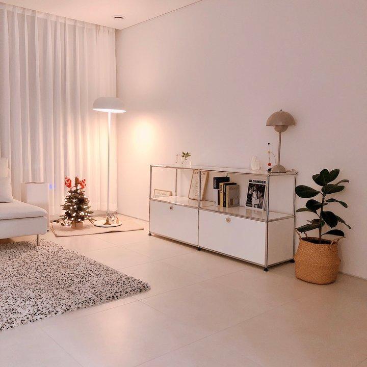 웜톤과 쿨톤 사이 밸런스를 맞추는 게 화이트 인테리어의 키포인트라고 생각해요. 그리고 무조건 한 가지 톤을 고집하다 보면 전체적으로 봤을 때 붕- 뜬 느낌이 들 수 있거든요. 그래서 이 카펫처럼 차분하게 컬러감을 눌러주는 게 필요했죠!