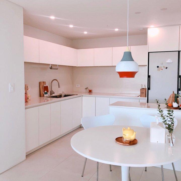 ㄱ자로 꺾이는 부분은 반드시 데드 스페이스가 생기기 때문에 고민이 되었는데 설거지 후 그릇 건조대를 놓기도 하고 이동식으로 사용하는 가전들(예를 들면 블랜더 같은...)을 쓸 때 좋은 위치더라구요. 그래서 코너 벽면에는 콘센트를 살려두었어요. 결론적으로는 조리 공간도 넓어지고 주방 동선 역시 편리해졌죠 :)
