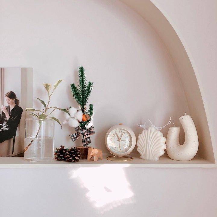 안방과 거실 사이의 벽은 비내력벽으로 허물 수 있는 공간인데요, 그 점을 살려서 안방 벽면 한쪽을 인서트 아치형 선반으로 만들었어요. 작은 소품들을 올려두었는데, 제품 촬영을 위한 포토 스팟으로도 활용하고 있습니다 :)