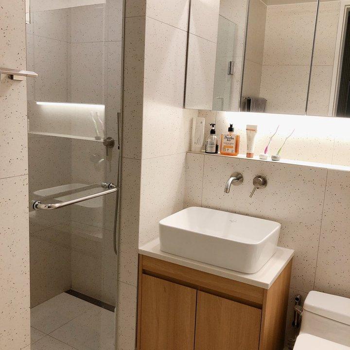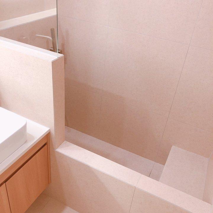 일반적인 30평대 초반의 아파트 욕실 사이즈에서 조적을 쌓는게 자칫 좁고 답답해 보일 수 있기에 조적벽은 젠다이 높이로 통일하고 상부는 물 튐 방지를 위해 유리로 마감해주었어요. 족욕을 위해 욕조 안에 반층의 계단도 만들었고, 퇴근하고 돌아온 겨울 저녁에는 따뜻한 반신욕도 하고 있답니다:)